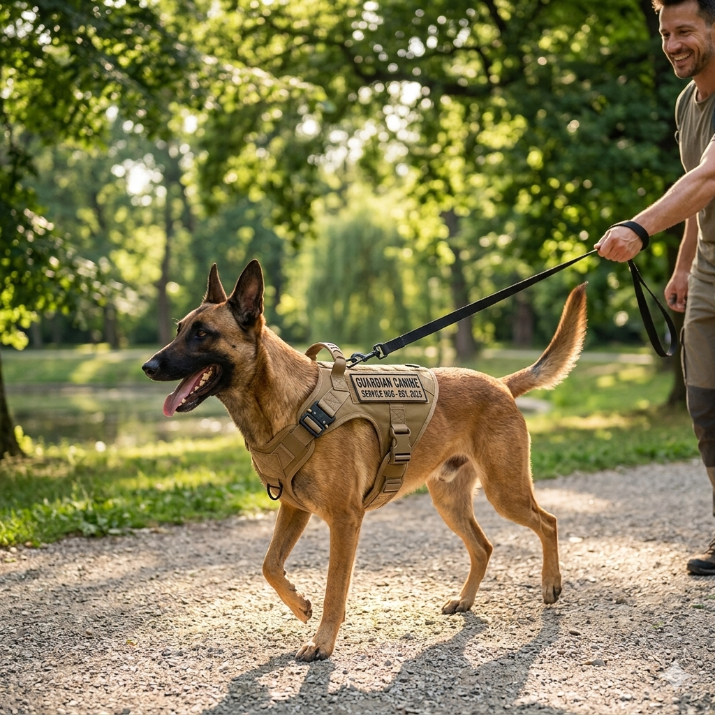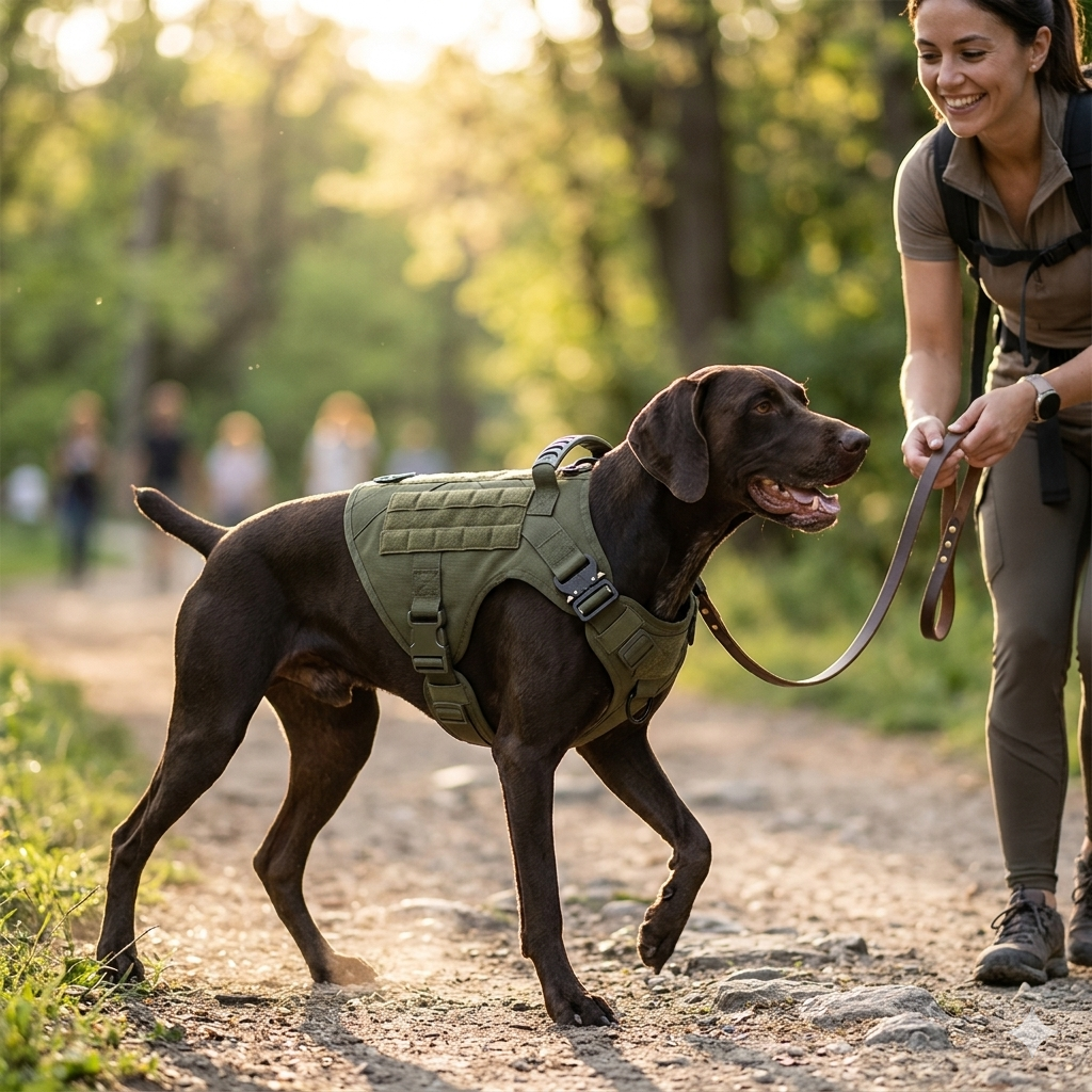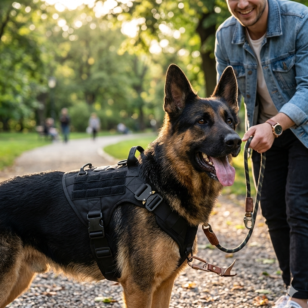 Featuring a reinforced top handle and quick-release metal buckles, this sleek black harness gives you instant control in busy city streets or crowded areas.